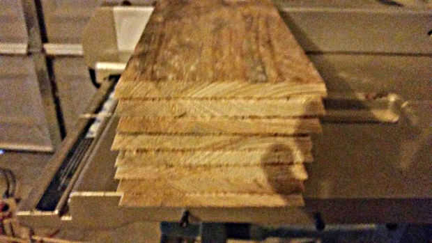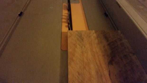 Ver las tablas y elegir el lado que desee en el exterior. Cortar las tablas con esta cara. Con la guía de valla en el lado derecho de la hoja, ajuste a la guía en 4 pulgadas. Cortar el primer ángulo con el lado cortado de la Junta contra la guía lateral. Giro de 180 grados de tablero (no flip) y el otro ángulo de corte.