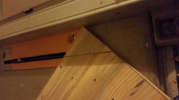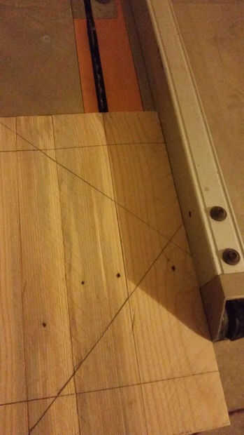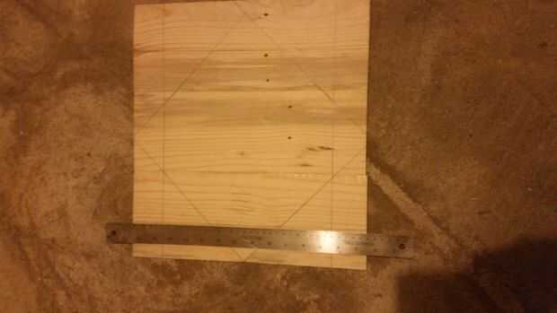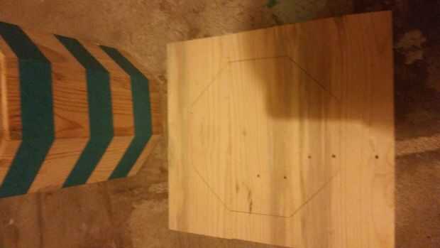 Octágono de centro en placa base. En el interior, marque un lado y parte inferior con lápiz como se muestra. Ahora en el exterior trazar el octágono. Con un borde recto marca líneas de corte extremo a extremo del tablero. Cortar las líneas dejando un poco espacio para el lijado posterior.