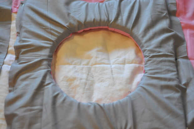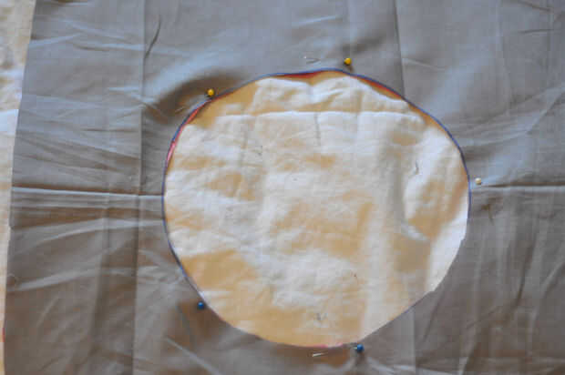 Prender los cuadrados de dos tela juntos y coser alrededor del diámetro del círculo.
