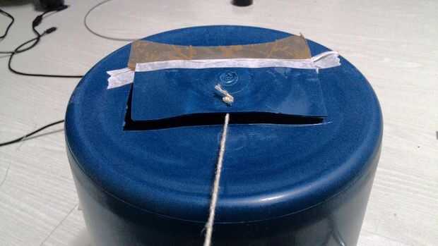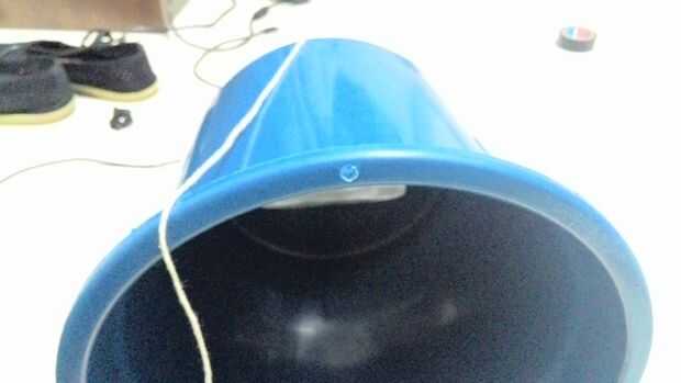 Quarto paso: passar o fio, por dentro balde, para o furo na lateral.