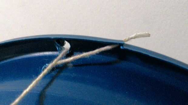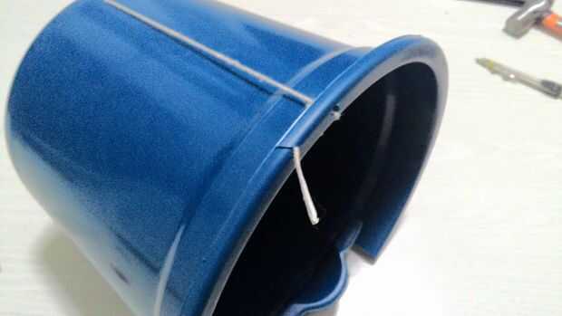 Primeiro passo: são 3 furos un feitos de serem (um na boca do balde, um na lateral próximo ao primeiro furo e um pequeno rasgo no sentido da diagonal, ao lado primeiro furo también).