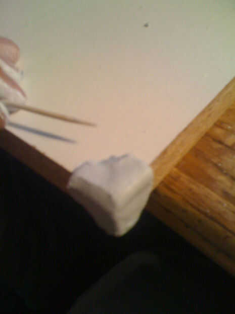 Encontrar un rincón suave (yo usé la esquina de la tabla que estaba trabajando) y crear una forma básica de la esquina. Medir contra la base y corte y remodelar groseramente en la esquina. Aplique un poco de agua en la esquina de la base y la parte posterior de la pieza nueva que les pegan. Aplicar sólo una ligera presión para no distorsionar la forma!