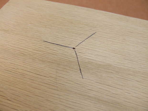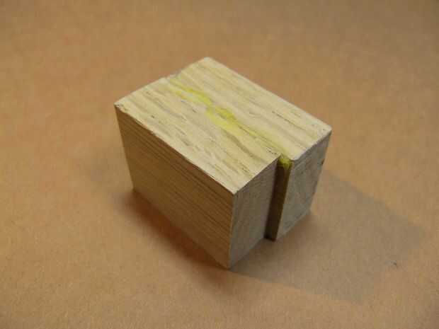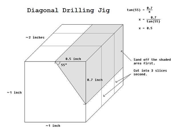 Primero encontrar una tabla para utilizar como base. Debe ser del tamaño de la mesa del taladro. A continuación encontrar un pequeño bloque de madera de 1 por 1 por 2 pulgadas. Te recomiendo una madera dura como roble. Utilizar algún tipo de lijadora para depilar de un ángulo de 55 cincuenta y cinco grados de uno de los lados largos. La forma más sencilla de hacerlo sin una lijadora de disco es para marcar el bloque con un lápiz. Puede usar trigonometría para calcular las dimensiones. Ver la segunda foto para más detalles. El ángulo no debe ir hasta el fondo del bloque. Esto levantará el dado de la base. Después de tener un ángulo de 55 grados, cortar el bloque de 3 piezas para que cada uno es bastante estrecho y ha inclinado uno lado.