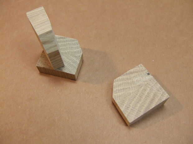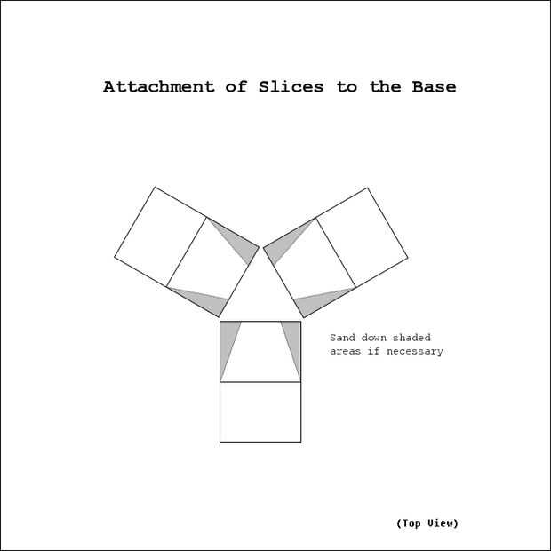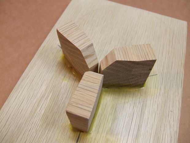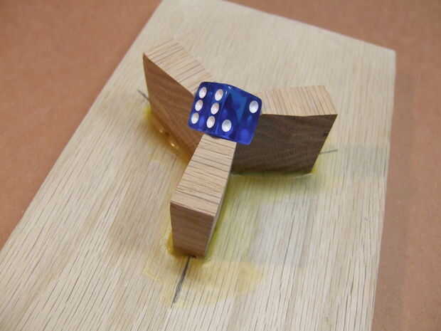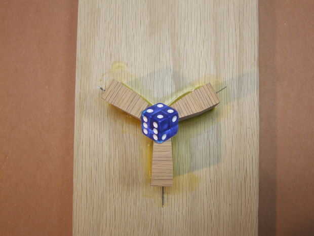 Colocar las rodajas en la base para que los lados del ángulo la cara hacia adentro (entre otros). Si sus rebanadas son demasiado anchos, deberás lijar hacia abajo en el extremo angular. Coloque un troquel en la depresión creada por los lados del ángulo y ajuste los bloques de manera que el troquel se ajusta perfectamente. Marque las posiciones de los bloques en la base con un lápiz, y luego pegarlos uno a la vez a la base. Cuando el pegamento se seca, la base es completa. Usted puede reforzar el pegamento con un tornillo, pero tenga cuidado de no partir la madera.