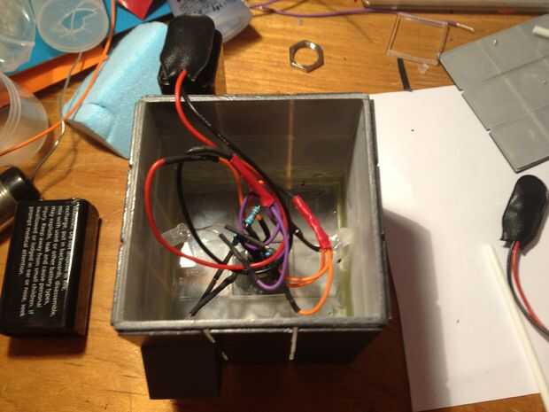 montaje de interruptor en la parte trasera el botón central negro de la prensa y luego coloca el interruptor en un cuadrado de plástico transparente, luego péguelo dentro del cubo para que la tecla negra se sienta dentro del agujero en la parte superior del cubo, se trata de cómo las luces se encienden y apaga.