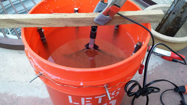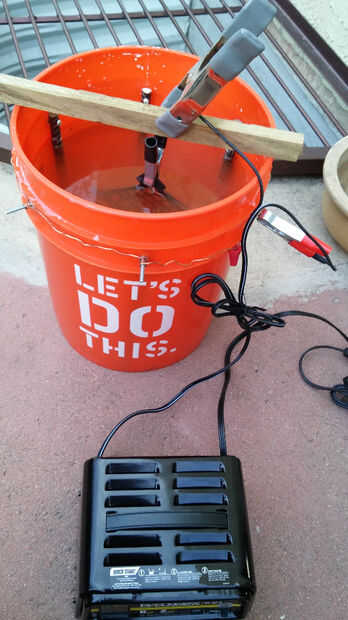 Conecte el cable de positive(red) para el circuito de alambre de cobre. Enchufe el cargador. Cargadores de batería de coche no todos trabajarán para esto. Usé un cargador de baterías Manual de tarifa de Schumacher SE-82-6 doble 2/6 Amp. Verá muchas pequeñas burbujas comienzan a subir a la superficie casi de inmediato. Si necesita solucionar problemas de tratar el siguiente: