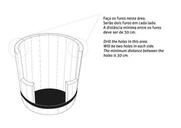Com un furadeira, crie os buracos na lateral hacen de balde, por onde una corda vai passar. PESQUISE como criar o nó ideal para balanços, lembrando ele deve formar um triângulo (como na próxima imagem) entre os furos para criar o equilíbrio.