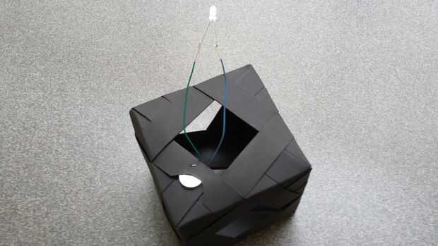 Después, junté el resto del cubo a partir de las dos unidades que utiliza para el cableado. Sólo cuando terminó el cubo hizo añadir el LED, pero no importa si añades el LED antes de terminar el cubo. Sólo asegúrese de que al agregar el LED que usted conecte los cables en la orientación correcta (polos, es decir positivo y negativo de la batería están conectados a los polos positivo y negativo del LED). Inserte la batería en la ranura pequeña hecha para ella y rodarla entre los dos cables ocultos en el bolsillo. Entonces arreglar tus bastones de LED que se ilumina antes de soldar o solo torciendo en su lugar. Realmente terminé poniendo dos LEDs en paralelo para el brillo adicional, pero depende de ti. Para difundir aún más luz, también terminó envolviendo un pedazo delgado de tejido alrededor de las luces.