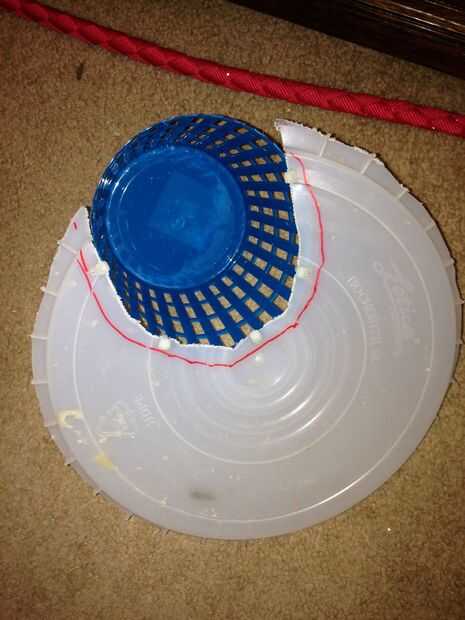 Una vez que han conseguido el centro separado de borde outter. Te va a ir a medirle estanque cubo hasta un poco menos de la mitad del cubo. La medición en la mía fue de alrededor de 4 ". Después se fue al lado de la pieza central de la tapa y cortar al agujero poco más pequeña que la abertura en el cubo de pod