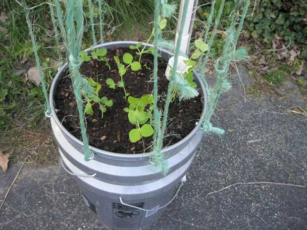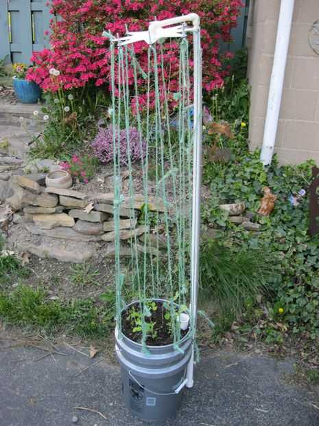 Puedes ver los agregué ojos scew alrededor del borde del cubo, hay 8. Añadí algunos PVC para hacer un mástil y utilizan viejos cordeles de carpeta para los frijoles para subir. Estoy seguro que hay infinitas maneras de hacer esto. Si se construye un cubo de frijoles nos dejan ver los resultados!