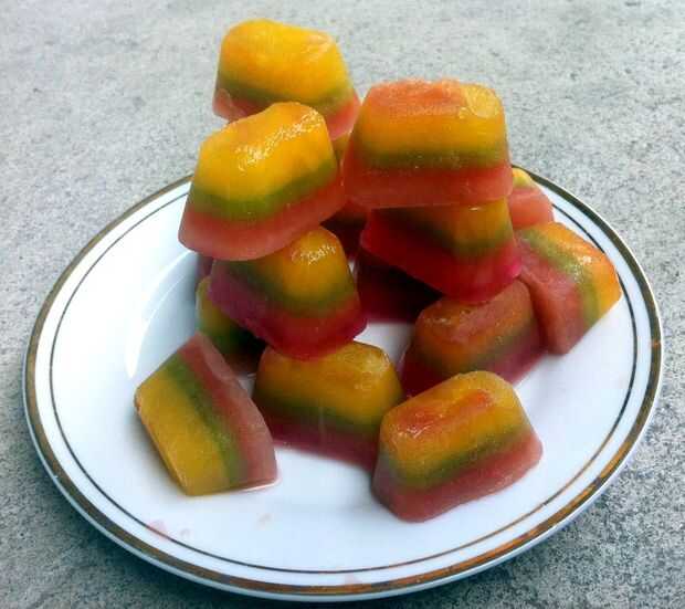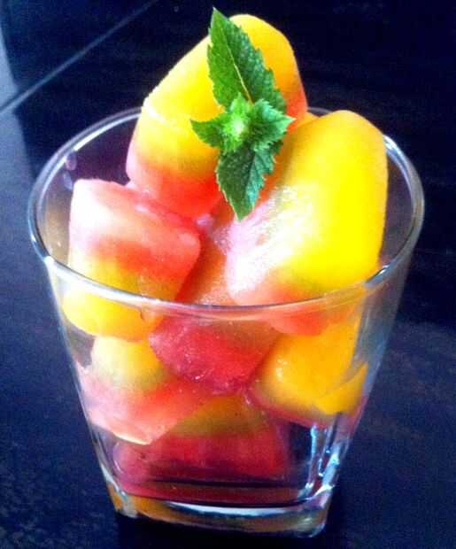 arco iris cóctel es impresionante, pero no tengo todos los ingredientes para hacer uno, así que hacer este cubo de hielo arco iris cóctel.Paso 1: Lo que usted necesita Color de hielo ingredientes• Sandía Smart• Mirinda naranja• Ywllow Gatorade• Manza