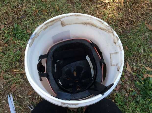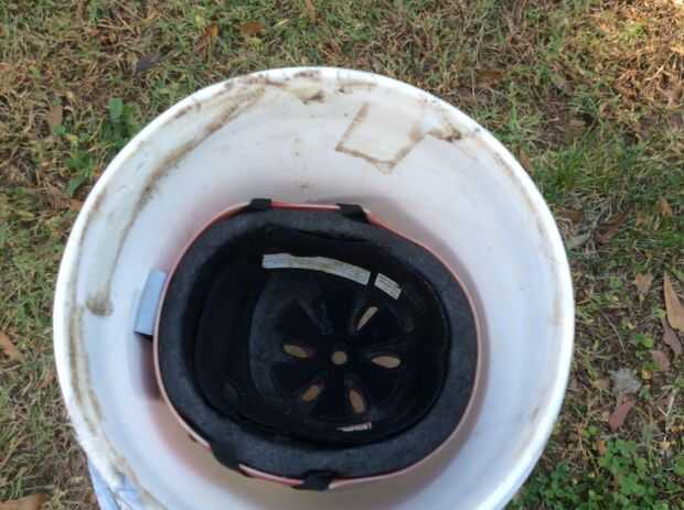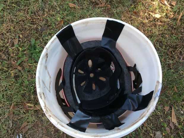 Utilice la cinta gorila para sujetar el casco dentro de la cubeta. Asegúrese de que el casco está cerca al borde de la cubeta para que sea cómodo de llevar. Había grabado en las correas en el lado del cubo y cinta desde el interior de los cascos en el interior de la cubeta en cinco lugares.