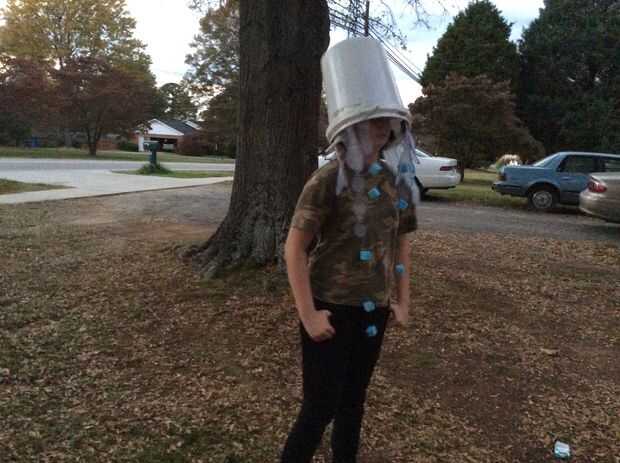 aquí es un disfraz de Halloween fue hace unos años. Mi hijo era un pollo, así que decidí ir con un tema. Este traje me costó $2 como tenía sobre todo todo en mano. El cubo fue un antiguo contenedor de goma que compró a costco hace unos años, y sólo p