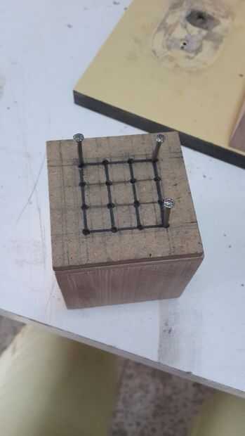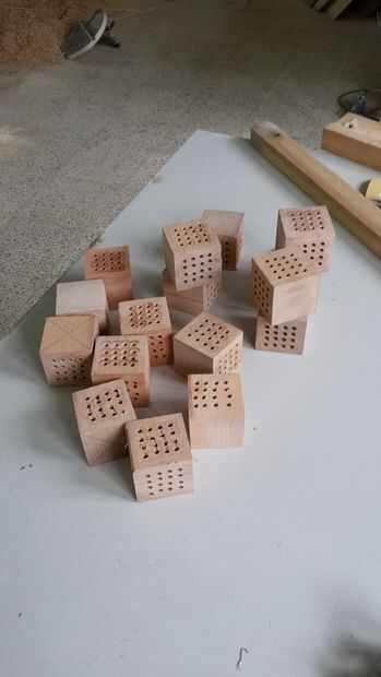 • En un 1 cm que cubos tienen que empezar a trabajar con la apertura de los orificios. Para ello, en primer lugar, en una placa de madera, preparar una plantilla de 5 x 5 x 1. Continuación, seleccione la diapositiva en esta plantilla de los agujeros preparados frascos.