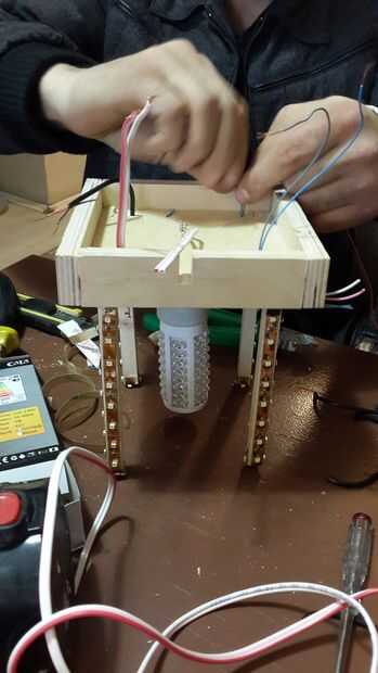 • Varillas de •Wooden Unidos a la superficie externa del cubo para ver ambos lados de la iluminación led. Luego en la base en medio el diámetro de un agujero arriba para escuchar, escuchar y sentido. Conectar con el LED instalado en el adaptador y conecte el adaptador que conecte todo el sistema de luz de un solo punto se elige.