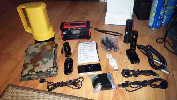 Ahora, tiempo para rellenar mi jaula llena de cosas! Colocado unas linternas pequeñas, una linterna de batería cuadrada más grande (todos tienen sus baterías, protegidos de la elaboración de electricidad en el tiempo), también lanzó en mi NOAA radio cargador/linterna que tiene un panel solar y lanzó en toneladas de cables y adaptadores, por lo que puedo cobrar lo que necesito a través del sol. Me tiré en un antiguo Ipod Nano sólo por diversión. También lancé en mi Kindle Paperwhite (que tiene un montón de libros de supervivencia, .pdf, .jpg y mucho más. El trabajo de camuflaje personalizado también hizo suya realmente, como es el caso hecho de una vieja Chaqueta BDU ;) Por último, arrojó en un bloc de notas con alguna información que he escrito sobre diversos temas.