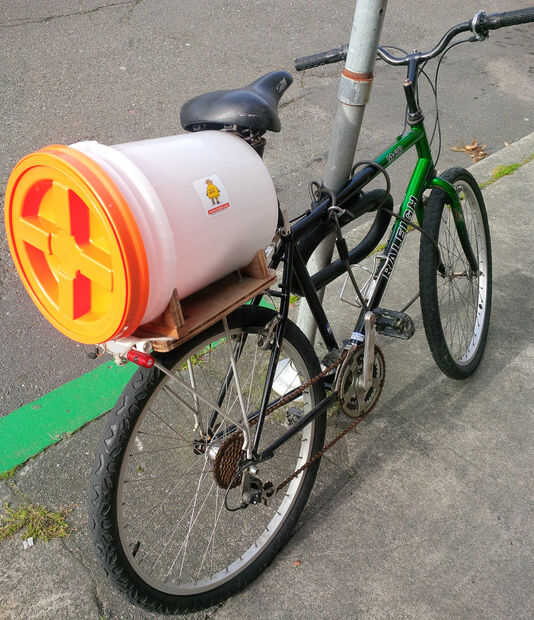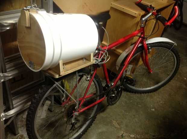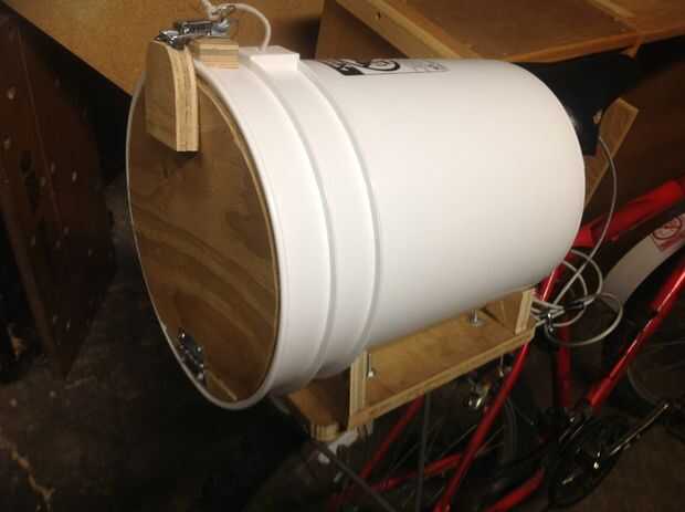Hay un montón de gente en el interwebnets que ha utilizado cubos para transportar carga en sus bicicletas, pero he visto que se haga de esta manera así que pensé que me gustaría probar: un cubo de 5 galones con una tapa de madera con bisagras, que se encuentra en la bandeja de carga. Este diseño tiene buen equilibrio, resiste la humedad y no añade mucho a la anchura total de la moto, es relativamente fácil de construir, utiliza materiales y que de lo contrario podrían encontrar su camino en un vertedero de basura. Pero la ventaja principal que se quería era un súper rápida de carga y descarga, y definitivamente tuve!