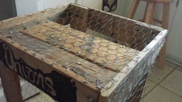 Paso 1: Utilice tornillos de 1/2 pulgada para montar seis tableros de plataforma 14" en una caja en forma de cubo. Añadir 2 placas de apoyo en la parte inferior del recipiente. Tapa los recipientes con 16 pulgadas de alambre de pollo y grapas a la parte superior delantera y placa de soporte del centro.