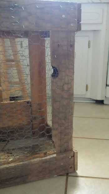 Grapa cable de pollo a lo largo de la altura de la papelera en los laterales y la parte posterior. Doblar bordes afilados y grapa en cada sharp señaló área luego engrape el alambre de pollo en la placa de apoyo de altura derecha delantera y repita este paso cuando llegue a la placa de soporte de altura delantera izquierda. Tire el cable firmemente y grapa en esquinas posteriores. No cubra la parte delantera de la bandeja con pollo.