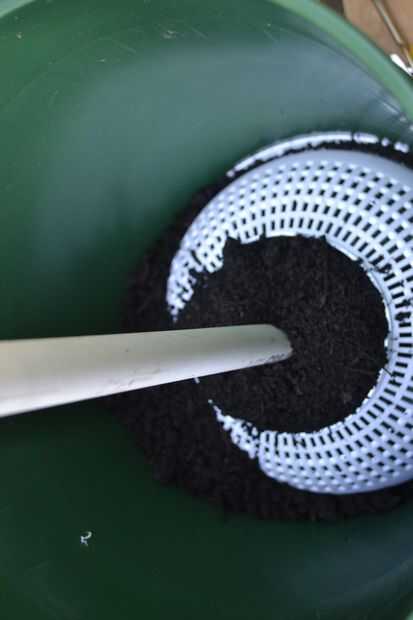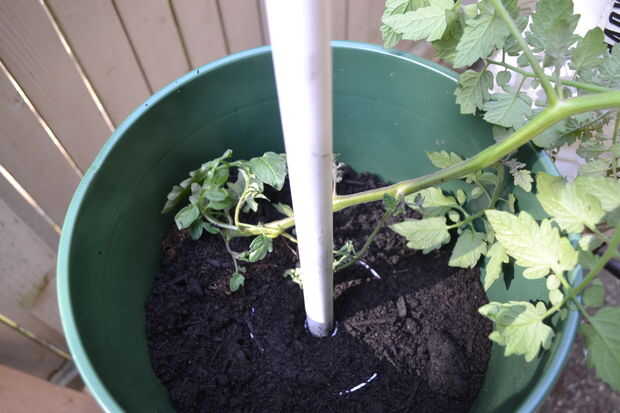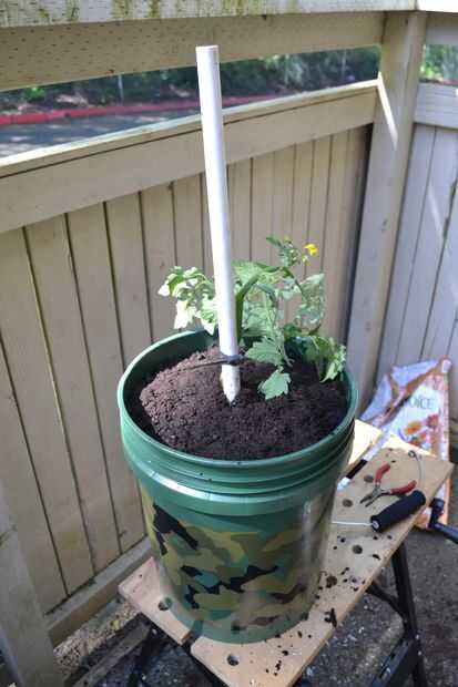 El suelo va en la parte superior del colador. Para plantas de tomate, dos terceras partes deben ser enterrados.