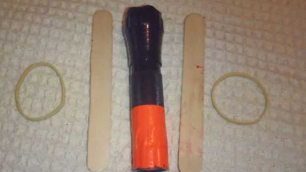 Primero necesita bandas de goma, 2 palitos y una linterna