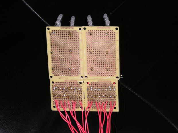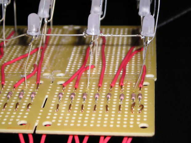 Para la base es bastante abierto terminó en lo que gustaría hacer.  Para mi simplemente utiliza un PCB (o pegan PCB) a mi cubo de la soldadura.  Una vez tuve mi cubo hecho yo soldar los cables de cada columna a una resistencia. Cada resistor fue conectado a otro cable que planeado para conectar el Arduino en. Usted también necesitará un cable soldado de cada capa para control negativo (sin resistor necesario). Usted puede hacer esta parte mucho mejor que la mía pero por razones de tiempo soldadas sólo a rápido.