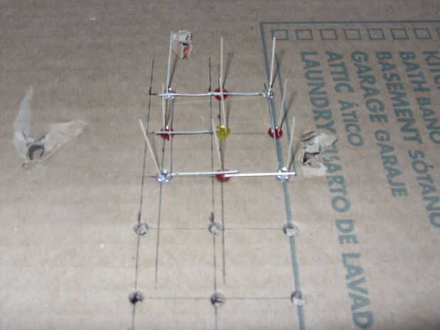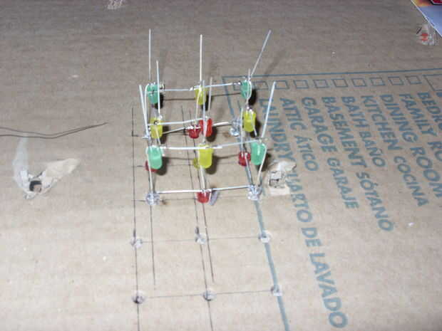 Cada capa de LEDs debe soldarse por separado. A cada capa de soldadura, meter los LEDs en los agujeros y doble hacia abajo de los cátodos para la soldadura de todos ellos para cada LED adyacente. Después de las tres capas han sido soldadas debe tener nueve cables del ánodo de cada capa. La soldadura de cada capa adyacente de ánodo conduce a la capa correspondiente.