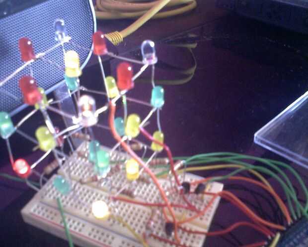 Ahora Conecte los tres Transistores NPN 3904 a la protoboard. El controlador y la base deben ser conectados para separar las tiras sobre la placa mientras que los emisores pueden conectarse a una tira. Conectar la tira de emisor a tierra. Conecte un resistor de 22 kohm cada base plomo y conecte a una clavija en el arduino. Usted sholud ahora cuentan con un total de 9 + 3 = 12 pins en el arduino. Conecte cada controlador a una conexión del cátodo separado en el LED. Cada controlador debe conectarse a una capa diferente.
