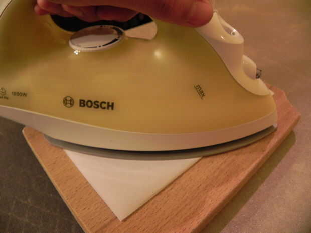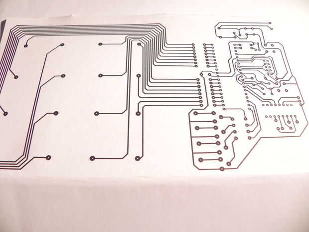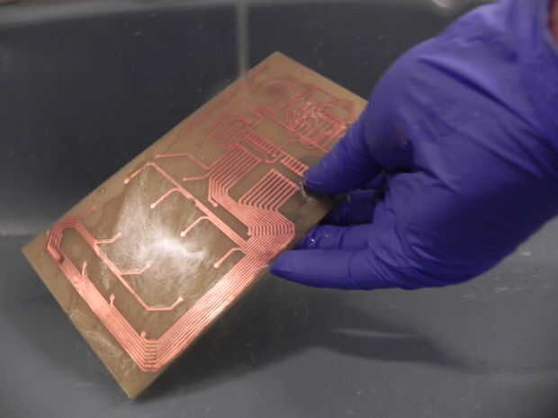 Ahora usted puede grabar abajo el cobre innecesario. ADVERTENCIA: Utilizar máscara y guantes de plástico!! Verter ácido clorhídrico al 30% concentrado en un recipiente de plástico. Poner la placa en el ácido hidroclórico y dejarlo allí durante unos segundos. Ahora vamos a agregar el peróxido de hidrógeno al ácido clorhídrico. Se puede ver que las sustancias reaccionan entre sí. Sobre después de 30-50 segundos puede quitar la Junta y enjuague con agua y jabón.