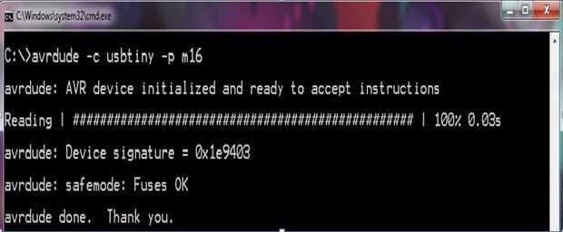 Conectar el programador a su cubo y su equipo. El comando es "avrdude - c usbtiny -p m16", wherer - c especifica el programador y -p el modelo AVR. Puede ver el resultado en las imágenes de abajo. Ahora, cargar el firmware: "avrdude - c usbtiny -p m16 - U flash:w:main.hex".