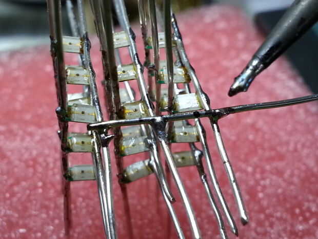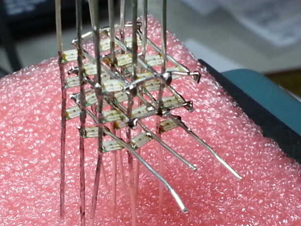 * Horizontalmente un alambre de la soldadura a través de los ánodos de los 3 LED. Un cable eso es para cada capa. Ahora tienes un 3 x 3 matriz de LEDs.