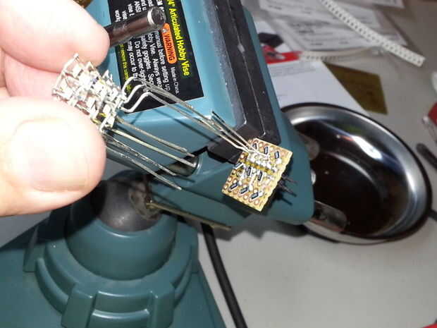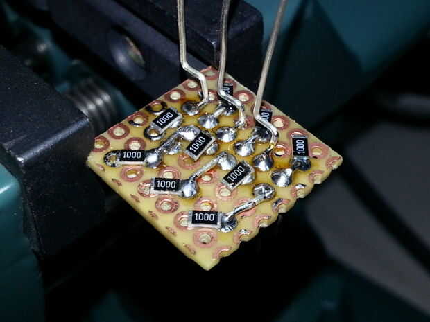 * Cuidadosamente la soldadura 9 SMD actual limitación resistencias (uno para cada columna) en las posiciones adecuadas en el perfboard.