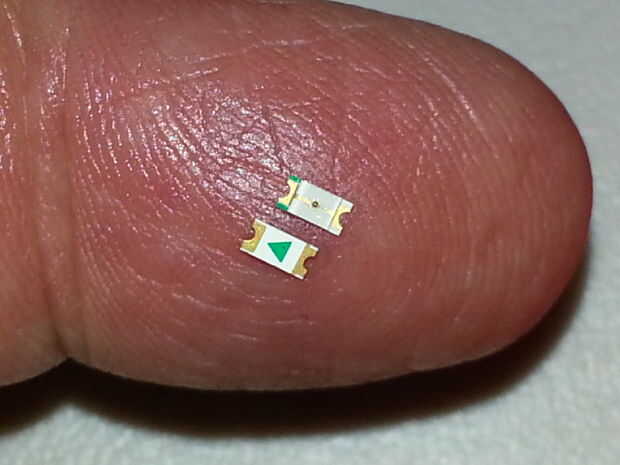 Las otras partes son LED verdes y resistencias de 100 ohmios limitadores de corriente que son SMD 1210 (3225 métrico). Son 0.126 × 0,098 en (3.2 × 2,5 mm). La compré de http://element14.com (http://newark.com). Necesitaba un poco más espacio y el componente de flexibilidad de diseño que el TinyShield Proto3 proporcionado, así que montar cabeceras en el Proto3 y había construido el cubo en un perfboard.