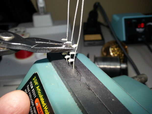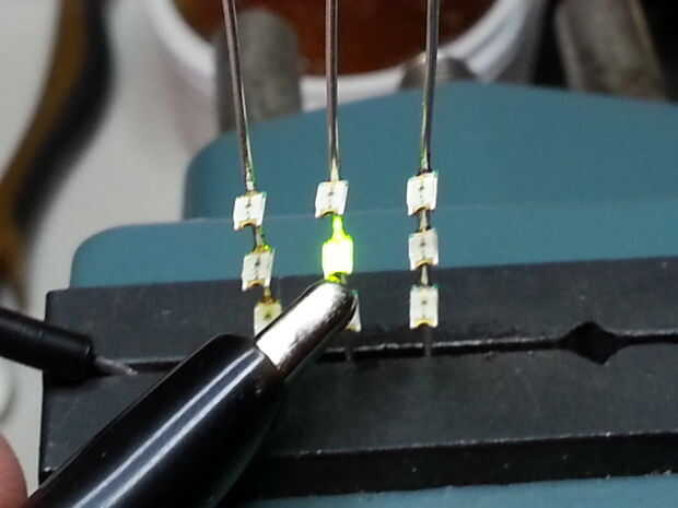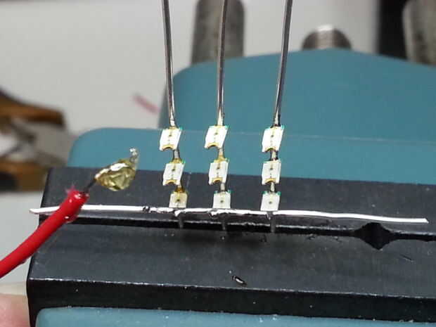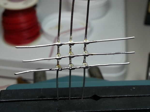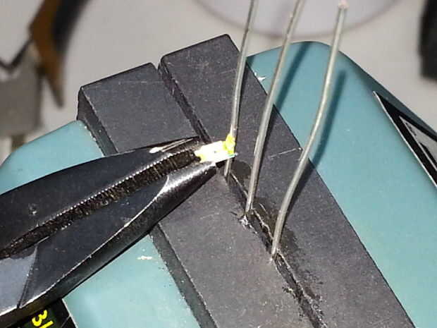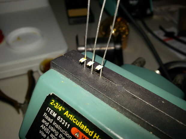 * Comience soldando con cuidado el extremo del cátodo de 3 LEDs a un alambre de columna (asegurados en un vicio), los espaciando aproximadamente 3/16" aparte.