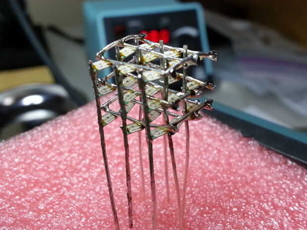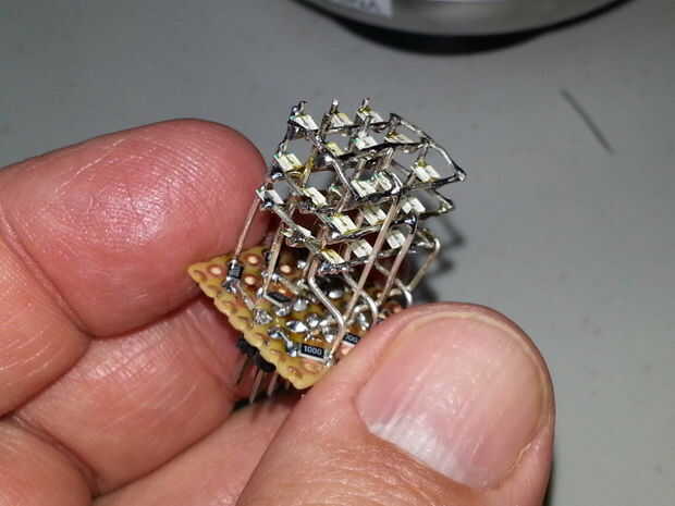 Había construido una "normal" 3 x 3 x 3 cubo del LED hace unos años, un poco de rueda libre la manera en que soldar los LEDs: http://youtu.be/Re5svahvZuo . Mi meta para mi código de cubo era conseguir la persona que mirarlo un poco ignorar los LEDs individuales y en su lugar acabo de ver una matriz de 3 x 3 moviendo el cubo. Su tecnología de reunión.
