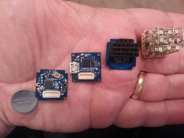 La idea de una versión más pequeña surgió cuando vi el TinyDuino Kickstarter (http://tiny-circuits.com/). Así que para esta compilación he utilizado el tablero TinyDuino (tiene un procesador Atmega328P - mismo que se utiliza en el Arduino Uno), un prototipo de "TinyShield" Proto3 protector y para la programación, un USB TInyShield (no se muestra en la mayoría de las fotos). Una pila de botón 3v montados en la parte posterior de las facultades de la Junta de TinyDuino todo! Después de 5 horas más o menos puedo decir los LEDs empiezan a atenuarse, pero sigue funcionando! [Nota a sí mismo: ver cuánto tiempo una batería nueva se ejecutará hasta deja de].