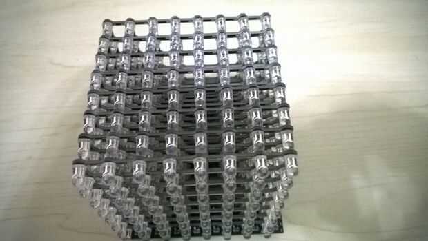 Se trata de un cubo 3D de Charlieplexed 64 RGB LED.El CharlieCube tiene un total de 192 LEDs y es controlada por 16 pines de arduino conectados 16 torres de 4 LED y 4 conexiones. Las conexiones de 64 que lleva 16 agujas de 4 están conectadas de tal m