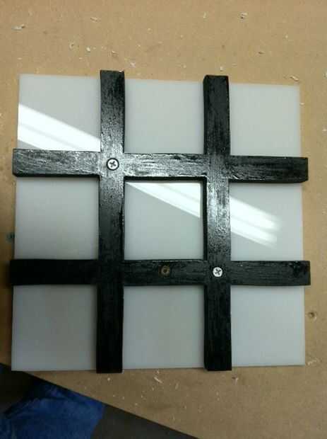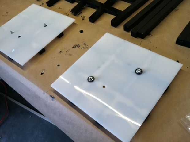 Tomar sus hojas de acrílico perforados y colocarlos en la parte posterior de cada lado pintado de mdf, alineándolos con los agujeros correspondientes en el lado de mdf, por lo que se están pegando sus tornillos de máquina de 1" a través de. Asegúrese que los lados del acrílico al ras con los lados del mdf. Tomar una arandela de nylon y una tuerca del metal y, con fuerza mínima, apriete las tuercas a mano. No apriete demasiado! Puede romper el panel acrílico.
