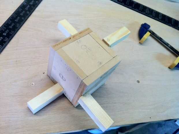 Tomar sus seis plazas más pequeñas de mdf y empotrar un cubo de 4 "x 4" sin tachuelas juntos todavía. Transcribir sus marcas a cada lado relativo de los diagramas dibujados a mano. En este momento necesita averiguar dónde montar los separadores madera del 2.5" cuatro a los lados del cubo interior de mdf. Cruz de referencia las lados/localizaciones apropiadas en su diagrama. Pre taladro correspondiente en cada lado. Pre taladro las ubicaciones apropiadas en ambos lados de cada uno de sus bloques espaciadores. Tornillo los bloques espaciadores a su lado de cubo interior mdf respectivos con tornillos para madera de 2" de negro. Tomar una pistola de clavos neumática y virar a su cubo con 1.25" clavos del clavito.