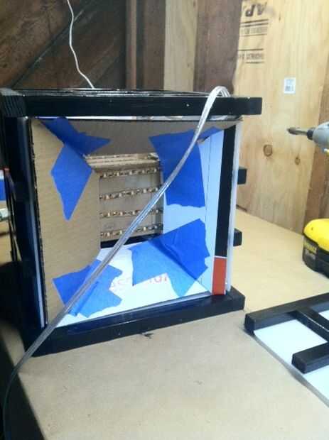 Antes de continuar a todos los lados exteriores de la tachuela juntos. Cortar 12 idénticamente tamaños particiones de cartón y cinta adhesiva en el cubo exterior. Estos bloquearán la luz del conjunto de lado a lado.