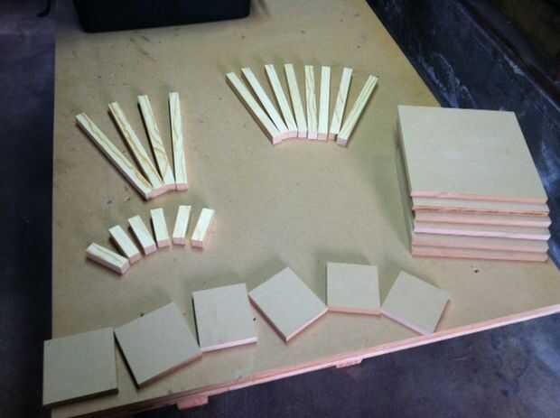 En la Sierra de inglete, corte dos secciones de 4" de 4"x 48"piezas de mdf para crear dos cuadrados de 4" x 4". Entonces, volver a la mesa vio a rasgar el resto ~ 40 "x 4" pieza de mdf en un ancho de 3". Toma esta pieza a la Mitra la sierra y corta dos piezas de 4" para crear dos cuadrados de 3" x 4". Luego en la Sierra de inglete corte dos plazas más de 3 "x 3". Ahora que terminaste con tus madera sierras. La imagen del paso 5 muestra todas las piezas que ha creado.