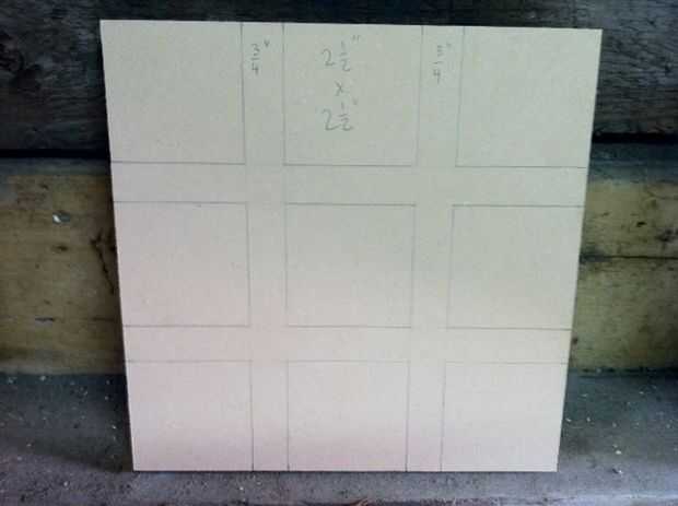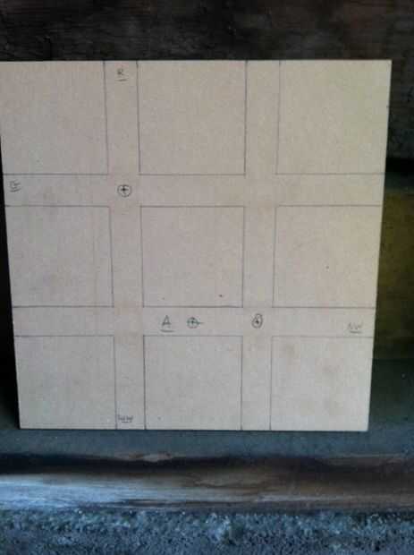 Foto 2: En este momento, también tendrá que marcar los agujeros a taladrarse en la pieza lateral. Se marcan tres agujeros total: dos en esquinas opuestas del interior cuadrado de la pieza lateral y un agujero que se centra en el interior cuadrado (4.5": desde cada lado exterior, ver segunda foto en este paso). Asegúrese de que las marcas de su agujero se centran en el medio de la. 75" grid. Nota: de los 6 lados total se necesitan los dos orificios en las esquinas opuestas del cuadrado interior. Sólo cuatro lados total tendrá el agujero centrado por un lado del cuadrado interior. Los orificios de esquina será orificios para los tornillos que se emperne abajo el panel acrílico lateral. El agujero de centrado será el agujero guía para el tornillo que unirá la pieza lateral para el espaciador de madera. Taladro y contador hunden los orificios marcados antes de continuar al siguiente paso. Fregadero de contador para acomodar la cabeza del tornillo en el lado externo. Fregadero de encimera ligeramente en el interior lado así.