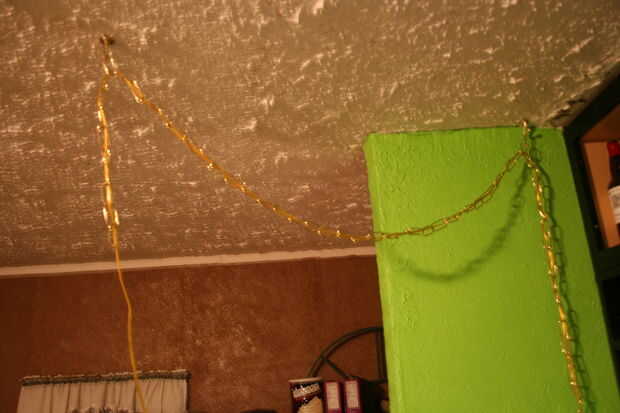 Para empezar, me medido y comprobado para montar el cubo cerca del centro de la zona de bar de contador. Luego montar los ganchos en el techo (Asegúrese de colocarlos en vigas), mide la cadena y rosca el cable eléctrico a través de la cadena. Me aseguré y extra más que suficiente para el cableado real que se hará más adelante a la izquierda. Entonces, puse la luz toma en el punto de conexión y había cableado ese cachorro.