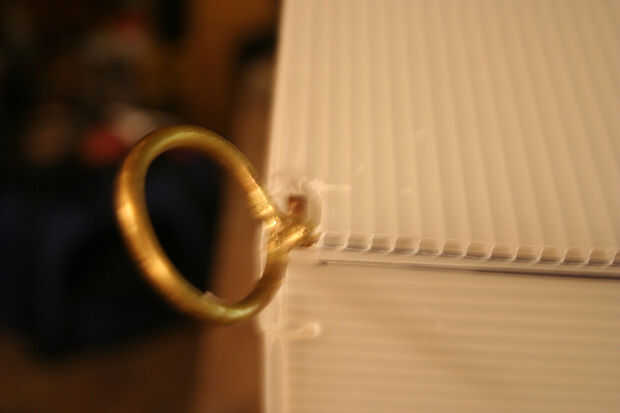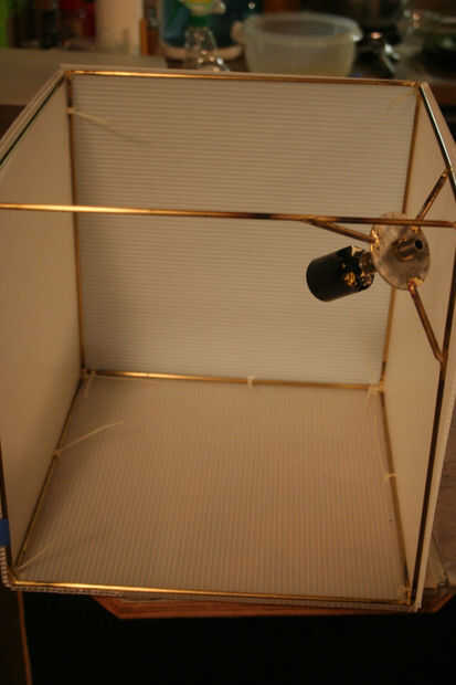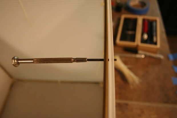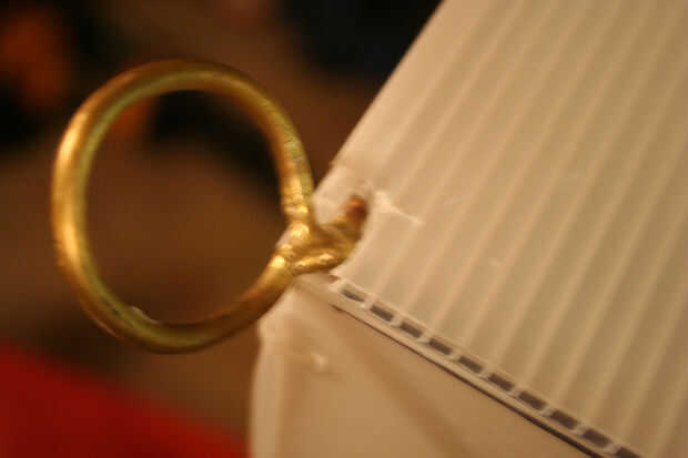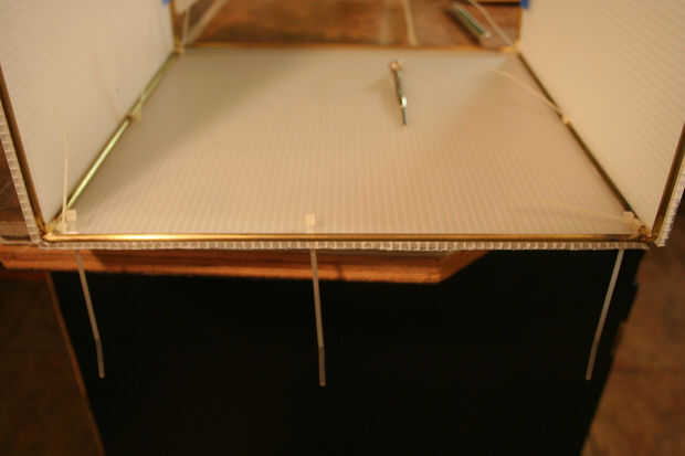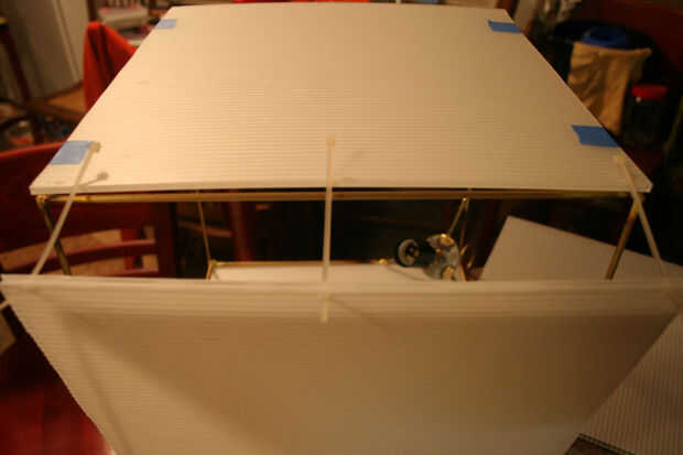 Después se cortan las hojas, es hora de fijar a la estructura metálica. Ahora es el momento para decidir que grupo va a colocar las bisagras para su uso posterior. Elegí el lado opuesto del aro para facilidad de uso. Utiliza el x-acto cuchillo y destornillador de joyero de un borde recto para cortar ranuras pequeñas cerca del borde del panel y utiliza una pequeña brida para sujetar en su lugar. Empecé con dos paneles laterales y había trabajado mi manera alrededor del cubo, colocar cuatro paneles a la estructura metálica. Una gran manera de engañar aquí es utilizar cinta algunos azul pintor o cinta adhesiva, para fijar los paneles de cartón corrugados.