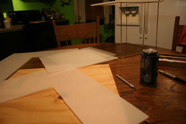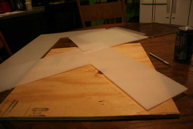 A continuación, me centré en el exterior de mi cubo impresionante pronto-a-ser. Las hojas de plástico vinieron en un tamaño de 20 "x 30", así que alguna x-acto cuchillo se llama para. Sin embargo, antes de que se corte-feliz un poco de matemáticas se llama para. Las hojas plásticas son 3/16" de espesor, y queremos que el cubo rincones parecen relativamente al ras (como sabíamos lo que estábamos haciendo), por lo que esto tiene que ser figurado en los tamaños de la hoja.