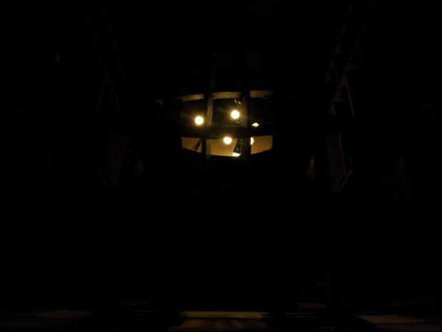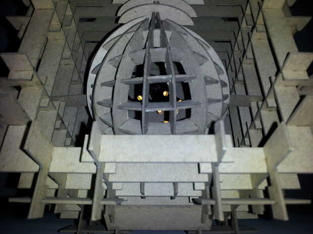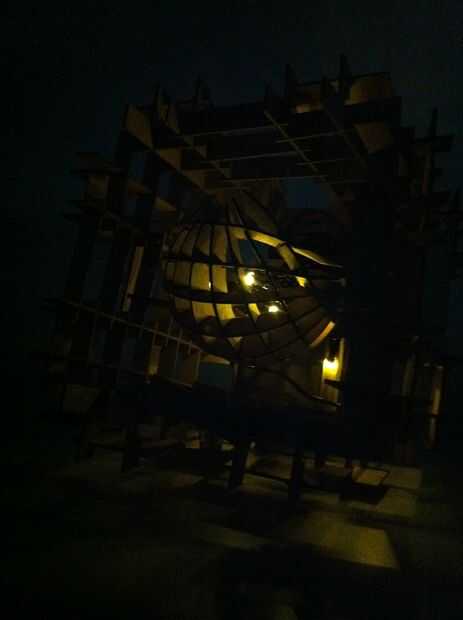 la luz dentro de la esfera y la sombra de la esfera a tierra del bastidor. Esfera es suspendida en el aire de cuatro conexiones, justo encima de la envolvente que esconde la caja de batería.
