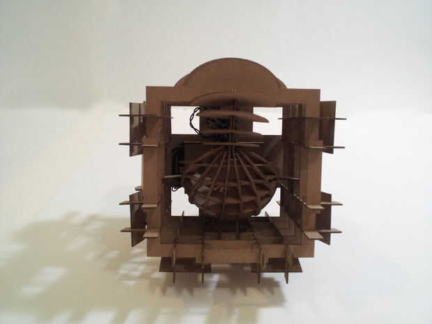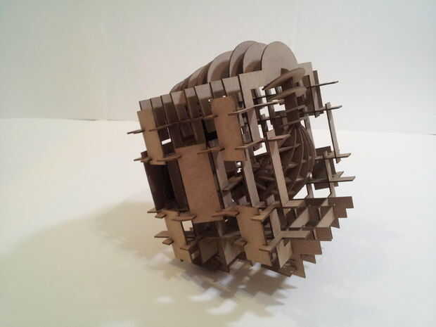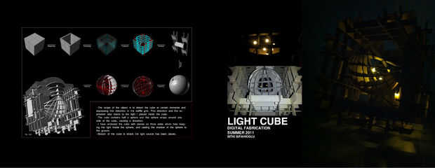 El alcance del objeto es torcer el cubo en ciertos momentos y expresando esta distorsión de la cuadrícula de la galleta. Esta distorsión y la expresión también reacciona a la luz se coloca dentro del cubo. El cubo contiene la mitad de una esfera y esta esfera envuelve alrededor un lado del cubo, causando una distorsión. Yo he incluido el cubo con los planos en los tres lados que ayudan a mantener