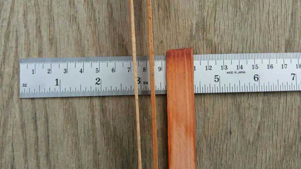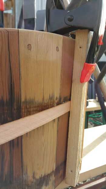 El cubo de redwood es cónico con la abertura más grande en diámetro que la parte inferior. En consecuencia, este afilado forma dio lugar a las bandas de madera roja no acostado completamente contra el lado del cubo. Esto dio lugar a brechas ocasionales entre las bandas de redwood y el lado del cubo. Como se ve en la foto 5, llena los huecos con pegamento de madera. El pegamento se endurece y forma un respaldo rígido que llena los vacíos y apoya a las bandas.