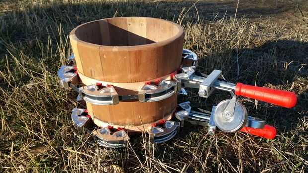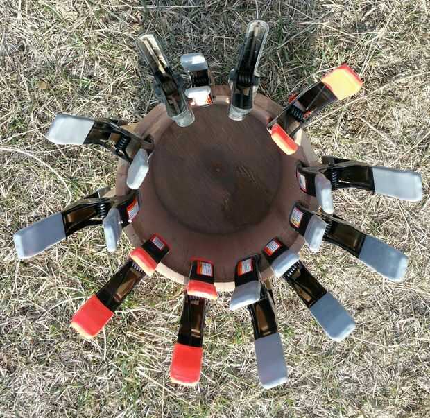 Tomé una tabla de redwood y arrancó pedazos finos de unos 2 mm (3/32 pulgadas) de espesor y 1 m (39,3 pulgadas) de largo, como se ve en la foto 1. Usando pegamento alimento-seguro, comenzó con uno de los extremos de la banda de madera y pegado al lado del cubo con las abrazaderas de muelle y bloques de madera para sujetarlo mientras seguía pegando más y más de la banda, como se ve en las fotos 2 y 3. Trabajando de esta manera mantenida la banda de madera de ajuste como había doblado a la forma redondeada del cubo. En lugar de cortar la banda cuando el punto de partida, sólo pegué la banda encima de sí mismo por lo que en algunos tramos hay un grueso doble de la banda de madera. Una vez que había puesto el pegamento, quita las abrazaderas de resorte y había reemplazado con una abrazadera (foto 4) y deje que se seque durante la noche.