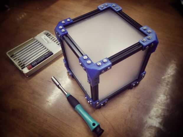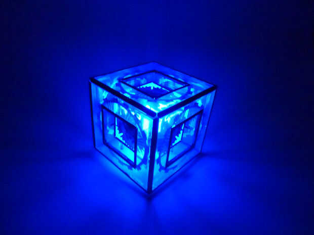 Después de conectar todos los bordes y diapositivas en todas las placas de acrílico en los perfiles - el cubo está terminado y parece holocrón.
